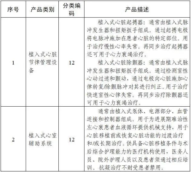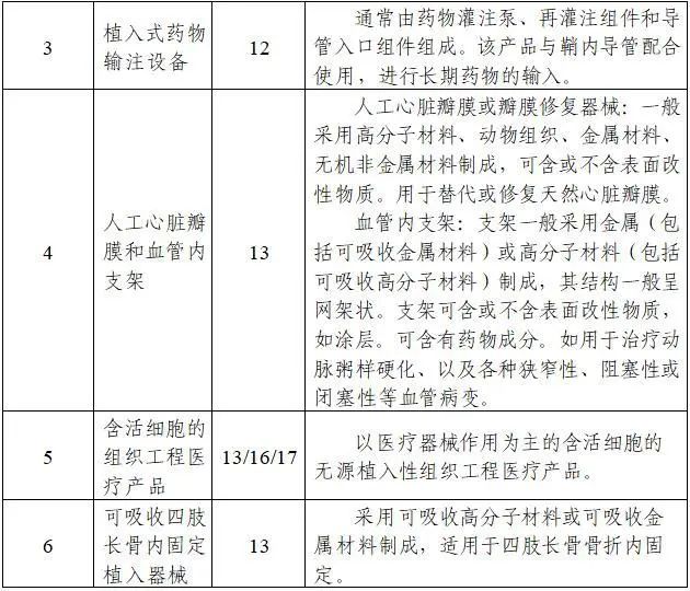 二、調整部分產品類別和描述。將“植入式心臟起搏器、植入式心臟除顫器、植入式心臟再同步復律除顫器”調整為“植入式心臟節律管理設備”,“植入式血泵”調整為“植入式心室輔助系統”,“植入式藥物灌注泵”調整為“植入式藥物輸注設備”,“境內市場上尚未出現的血管內支架系統”調整為“人工心臟瓣膜和血管內支架”;將“境內市場上尚未出現的植入性人工器官、接觸式人工器官、骨科內固定產品及骨科填充材料”調整為“含活細胞的組織工程醫療產品”;將“可吸收四肢長骨內固定產品”調整為“可吸收四肢長骨內固定植入器械”。相應的產品描述也進行了細化和明確。